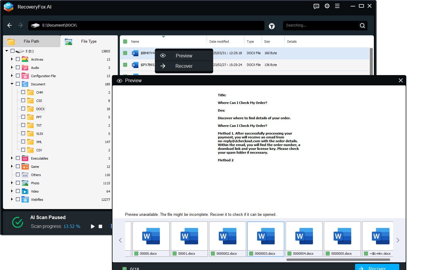 Van Office-documenten en e-mails tot foto’s, video’s, audio en gecomprimeerde bestanden – WonderFox Recovery AI herstelt meer dan duizend verschillende bestandstypen.
